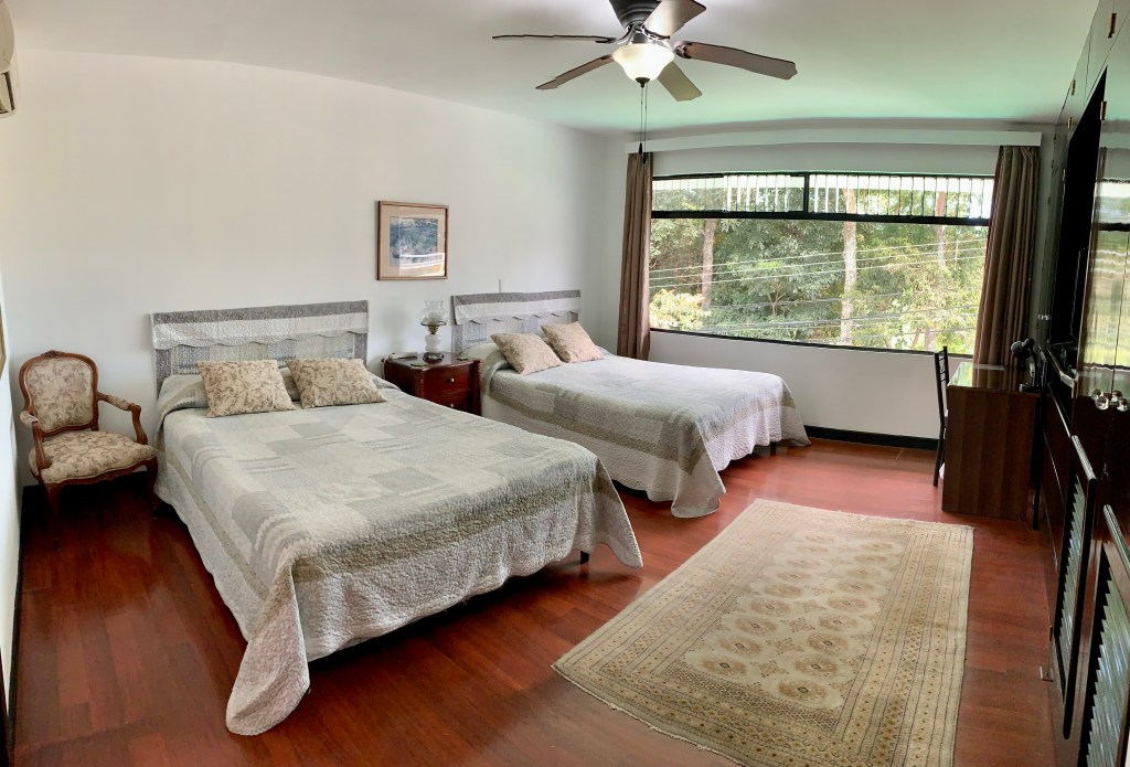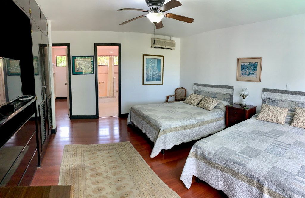 One of 4 bedrooms in an elegant, sunny and spacious home. This de luxe room with two queen-size beds offers quality mattresses and bedding, an en-suite bathroom with towels, hair-dryer and toiletries, a large walk-in, a work-desk, ceiling fan, A/C, in-room cable TV and free high-speed Wifi, maid service, complimentary breakfast and all-day kitchen use. Free storage in case of return. Laundry service. Free in-door parking with remote-controlled garage entrance.